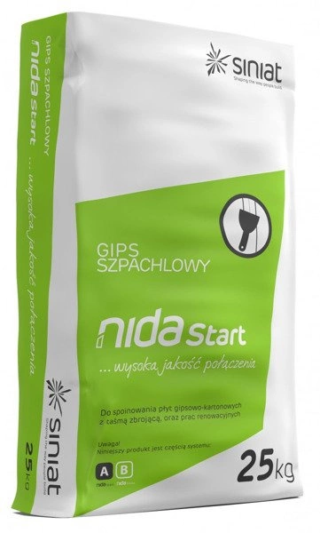 Gips szpachlowy NIDA Start przeznaczony do wstępnego, ręcznego spoinowania połączeń płyt gipsowo-kartonowych z taśmą zbrojącą a także do montażu narożników oraz uzupełniania ubytków. Do stosowania wewnątrz budynków. Stanowi system z produktem NIDA Finisz.