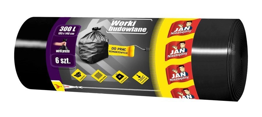 Worki na odpady budowlane, które pomogą przywrócić czystość po remoncie i w jego trakcie. Ich pojemność to 300 litrów, a konstrukcję przygotowano ze wzmocnionej folii. Na rolce znajduje się 6 sztuk worka.