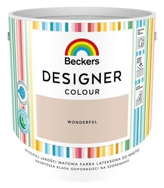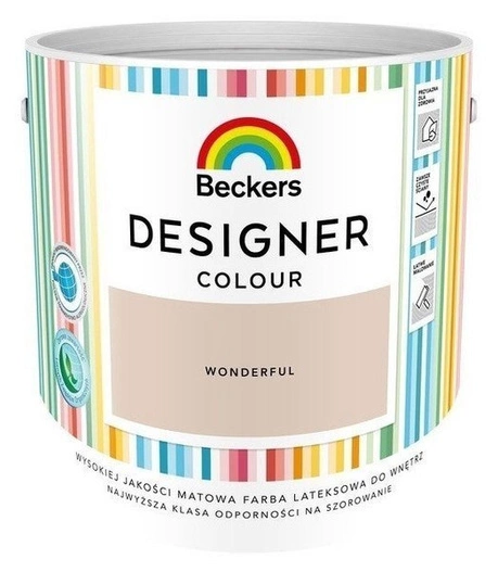Beckers Designer Wonderful 2,5l to wysokiej jakości, matowa farba lateksowa przeznaczona do malowania ścian i sufitów wewnętrznych. Dzięki nowoczesnej formule farba zapewnia piękne, matowe wykończenie, które nadaje wnętrzom elegancji i świeżości. Produkt wyróżnia się bardzo dobrą siłą krycia, trwałością koloru oraz odpornością na mycie wodą z dodatkiem detergentu. Farba jest łatwa w aplikacji, nie chlapie i równomiernie pokrywa powierzchnię, gwarantując doskonały efekt końcowy. Rekomendowana przez Polskie Towarzystwo Alergologiczne, sprawdzi się w domach, gdzie liczy się zdrowie i komfort użytkowników.