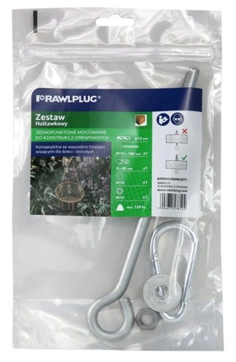 Zestaw huśtawkowy Hak M10x180/220 i karabińczyk doskonale sprawdzi się do montażu huśtawek ogrodowych, foteli wiszących typu kokon, drabinek, kanap ogrodowych oraz ścianek do wspinaczki. Przeznaczony jest do konstrukcji drewnianych, zarówno w ogrodzie, jak i wewnątrz domu.
