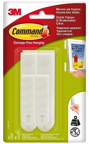 Zestaw rzepów do zawieszania obrazków, ramek i innych dekoracji. Pozwalają na bezinwazyjny montaż, bez konieczności wiercenia dziur w ścianach. Zestaw zawiera 4 komplety średnie i 8 dużych. W zależności od konfiguracji, pozwalają na zawieszenie przedmiotów o wadze 5,4 kg, a nawet 7,2 kg. Maksymalny rozmiar zawieszanego obrazu to 60 x 90 cm. Rzepy przeznaczone są do stosowania wewnątrz pomieszczenia.