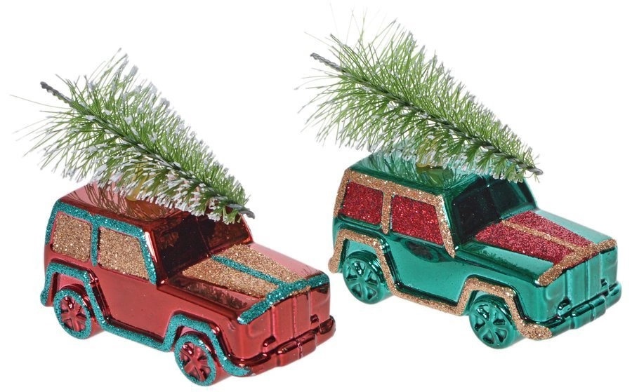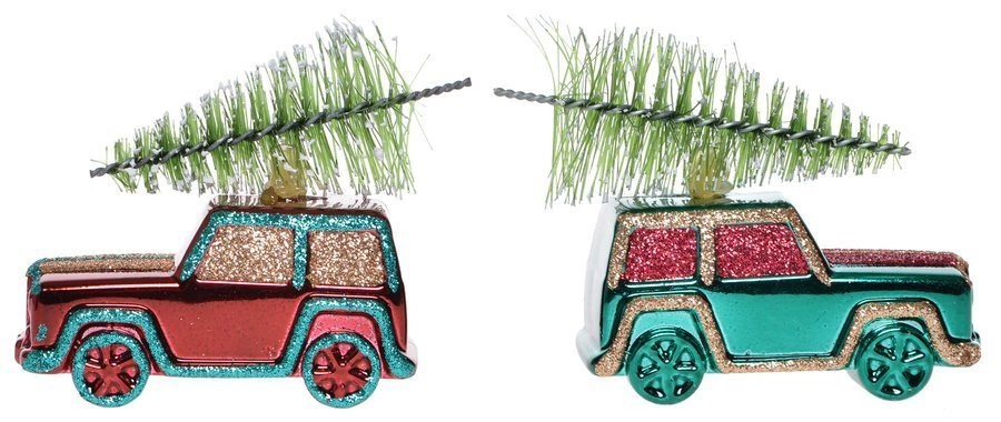 - Bombki zielono-czerwone auta z choinką 2 sztuki