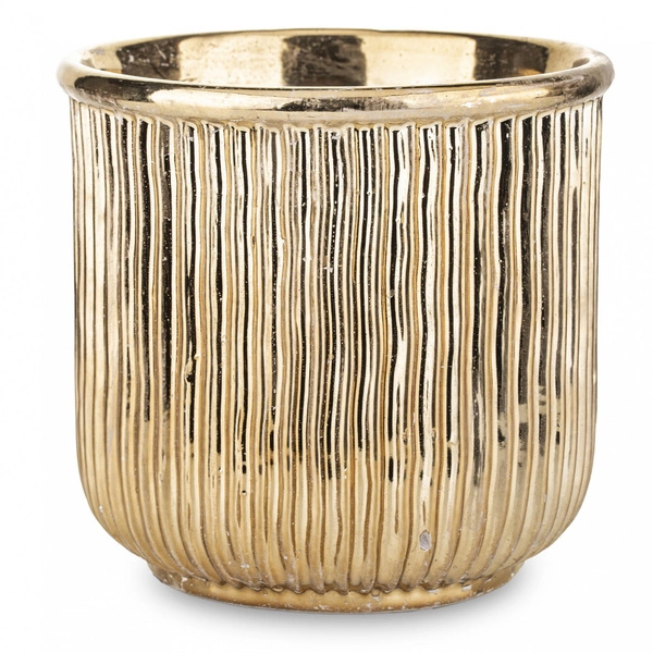 Osłonka kamionka w kolorze złotym, z plisowaną powierzchnią, jest atrakcyjnym sposobem na podkreślenie uroku rośliny. Wzornictwo i kolorystyka sprawiają, że ma ona charakter uniwersalny, ale jednocześnie doskonale komponuje się z okresem zimy i świętami Bożego Narodzenia.