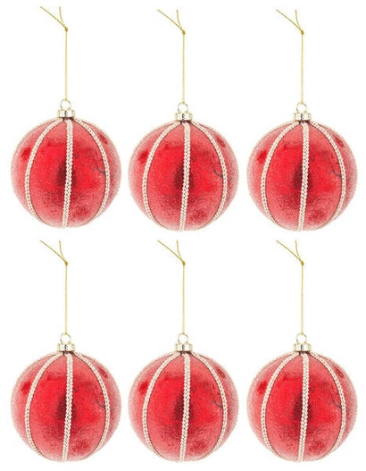 Bombki choinkowe przygotowane w klasycznej, okrągłej formie. Wykonane zostały w czerwonym, wyrazistym kolorze i udekorowane łańcuszkiem. Wykonane z tworzywa, stanowią alternatywę dla klasycznych, szklanych zawieszek, gwarantując znacznie większą trwałość i wytrzymałość. Sprzedawane w opakowaniu po 6 sztuk.
