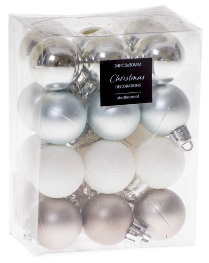 Bombki choinkowe przygotowane w klasycznej, okrągłej formie. Wykonane zostały w pastelowych, stonowanych i delikatnych barwach. Przygotowane z tworzywa, są alternatywą dla szklanych dekoracji, zapewniając większą trwałość i wytrzymałość. Sprzedawane w opakowaniu po 24 sztuki.