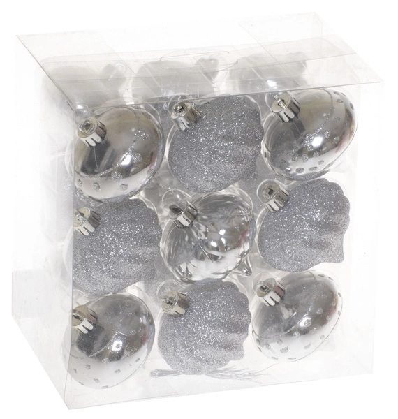 Bombki choinkowe przygotowane w jednakowej stylizacji kolorystycznej - srebrnej, ale w trzech rodzajach wzorów. Ze srebrnymi liniami i śnieżynkami, brokatowe i żłobione. Stanowią bardzo atrakcyjną formę dekoracji bożonarodzeniowego drzewka, podkreślającą klimat i nastrój świąt. Przygotowane w kształcie bączków.