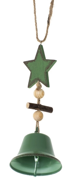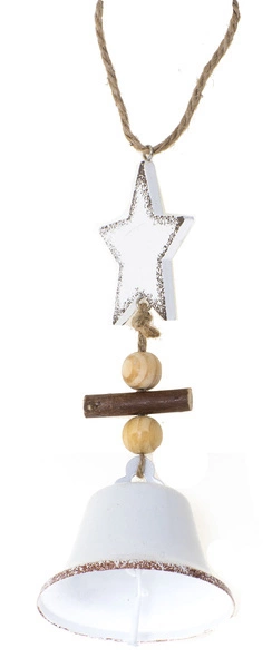 Zawieszka bożonarodzeniowa, którą przygotowano jako drewnianą gwiazdę i metalowy dzwonek. Osadzono to na jutowym sznurku i udekorowano drewnianymi koralikami i kawałkiem gałązki. Wnętrze wypełnia magią świąt i roztacza klimat po całym domu.