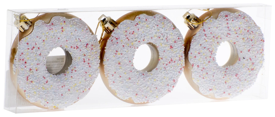 Bombki choinkowe przygotowane w kształcie donutów, pączków. Stanowią bardzo atrakcyjną formę dekoracji bożonarodzeniowego drzewka, podkreślającą klimat i nastrój świąt. Wprowadzają do wnętrza wesołą atmosferę i cieszą oko.