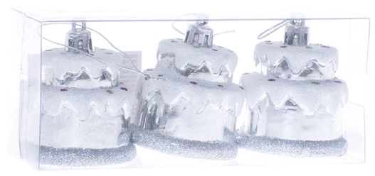 - Zestaw trzech bombek w kształcie tortu, każda o średnicy około 5 cm.