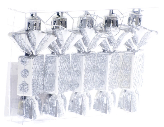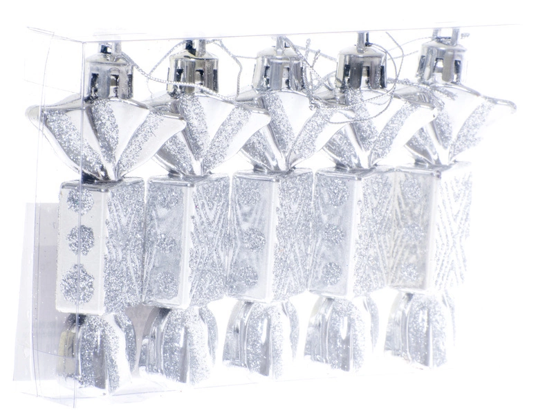 Bombki choinkowe przygotowane w kształcie cukierków. Wykonane zostały w jednym kolorze - srebrnym. Stanowią bardzo atrakcyjną formę dekoracji bożonarodzeniowego drzewka, podkreślającą klimat i nastrój świąt. Wprowadzają do wnętrza ciepłą atmosferę i cieszą oko.
