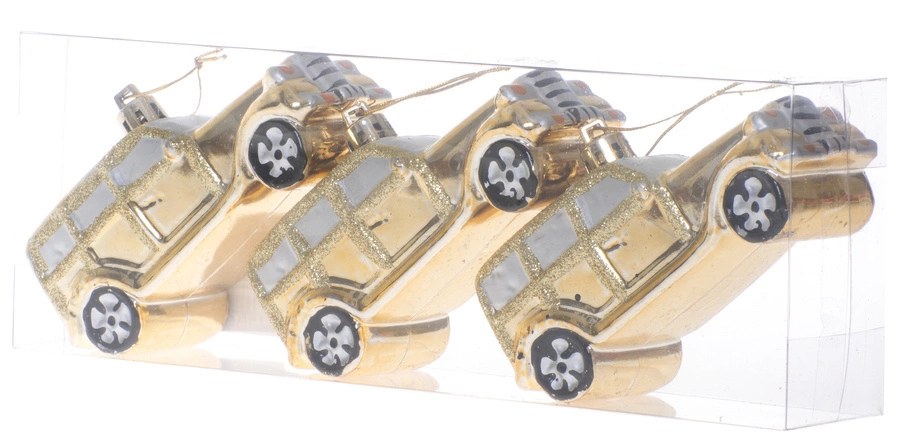 Bombki choinkowe przygotowane w kształcie samochodów. Stanowią bardzo atrakcyjną formę dekoracji bożonarodzeniowego drzewka, podkreślającą klimat i nastrój świąt. Wprowadzają do wnętrza ciepłą atmosferę i cieszą oko.