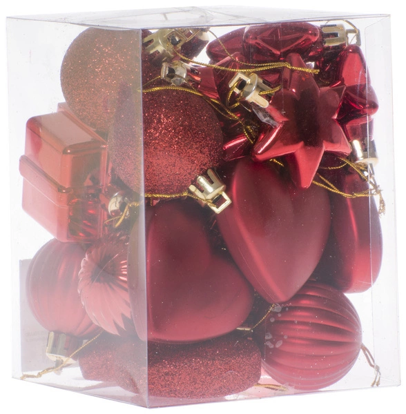 Bombki choinkowe przygotowane w jednej stylistyce kolorystycznej - czerwonej, ale w różnych kształtach - kule, prezenty, gwiazdki, serca. Stanowią bardzo atrakcyjną formę dekoracji bożonarodzeniowego drzewka, podkreślającą klimat i nastrój świąt. Wprowadzają do wnętrza ciepłą atmosferę i cieszą oko.
