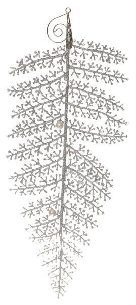 Zawieszka choinkowa przygotowana w formie sztucznej gałązki paproci. Stworzono ją w srebrnym kolorze, obsypano drobnym, mieniącym się brokatem i ozdobiono sztucznymi perłami. Prezentuje się wyjątkowo okazale, nie tylko na bożonarodzeniowym drzewku, ale w każdym innym miejscu domu. Tworzy i utrzymuje nastrój oraz klimat świąt.
