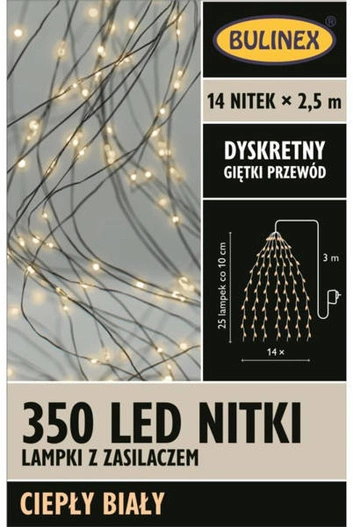 Oświetlenie świąteczne do stosowania wewnątrz, które przygotowano z wykorzystaniem 350 diod LED, osadzonych na przewodzie (14 przewodów po 2,5 metra każdy). Lampki świecą ciepłym, białym światłem. Stanowią bardzo atrakcyjną dekorację, która nadaje ogromnej magii w czasie świąt Bożego Narodzenia.
