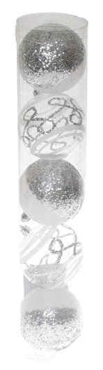 Bombki choinkowe przygotowane w klasycznym, okrągłym kształcie. Część z nich jest transparentna ze srebrnym szlaczkiem, część biała ze srebrnym brokatem. Stanowią bardzo atrakcyjną formę dekoracji bożonarodzeniowego drzewka, podkreślającą klimat i nastrój świąt. Wprowadzają do wnętrza ciepłą atmosferę i cieszą oko.