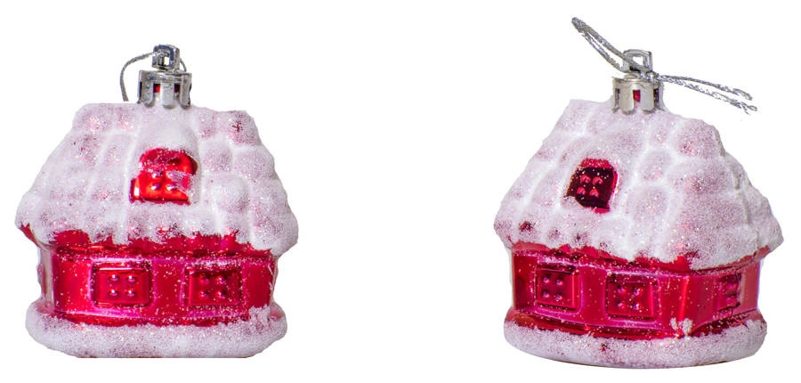 Bombki choinkowe przygotowane w wyrazistym, atrakcyjnym kolorze - czerwonym. Wykonane zostały w kształcie domków. Stanowią bardzo atrakcyjną formę dekoracji bożonarodzeniowego drzewka, podkreślającą klimat i nastrój świąt. Wprowadzają do wnętrza ciepłą atmosferę i cieszą oko.
