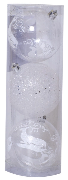 Bombki choinkowe przygotowane w klasycznym, okrągłym kształcie. Utrzymane zostały w jednej stylistyce kolorystycznej - połączeniu przezroczystości z bielą. Część z nich ozdobiona jest wzorem z reniferami, część jest biała z brokatem. Stanowią bardzo atrakcyjną formę dekoracji bożonarodzeniowego drzewka, podkreślającą klimat i nastrój świąt. Wprowadzają do wnętrza ciepłą atmosferę i cieszą oko.