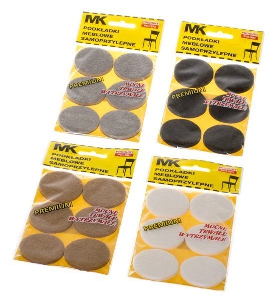 Opakowanie podkładek filcowych, przygotowanych w grubej, solidnej wersji. Dzięki swojej wzmocnionej strukturze są odporne na duże obciążenia. Wyposażone zostały w warstwę klejącą, dzięki czemu są bardzo łatwe w montażu. Skutecznie chronią powierzchnię podłogi przed zarysowaniami.