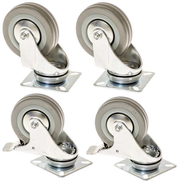 Zestaw czterech kół obrotowych składający się z kół o średnicy 75 mm (dwa koła z hamulcem i dwa bez hamulca). Pozwalają na uzyskanie maksymalnego obciążenia do 200 kg (po 50 kg na każde koło - należy pamiętać, że wagę liczymy z uwzględnieniem wagi przedmiotu, do którego mocujemy koła).