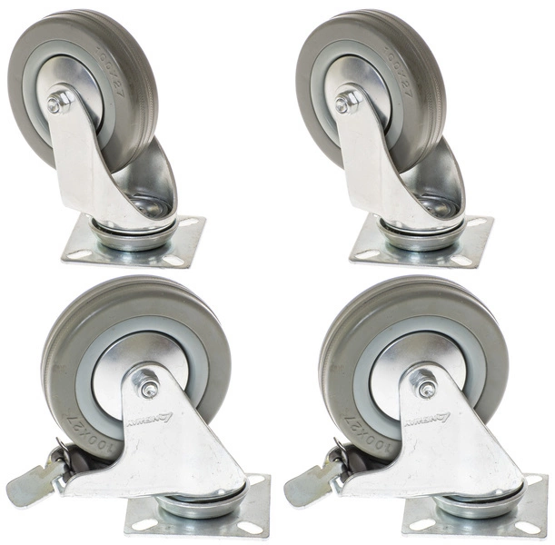 Zestaw czterech kół obrotowych składający się z kół o średnicy 100 mm (dwa koła z hamulcem i dwa bez hamulca). Pozwalają na uzyskanie maksymalnego obciążenia do 320 kg (po 80 kg na każde koło - należy pamiętać, że wagę liczymy z uwzględnieniem wagi przedmiotu, do którego mocujemy koła).
