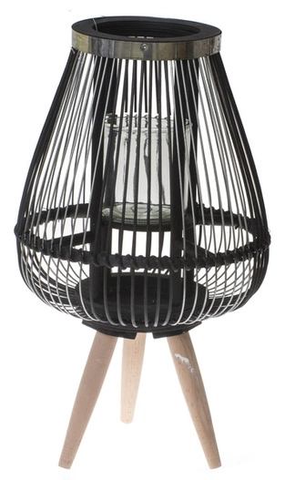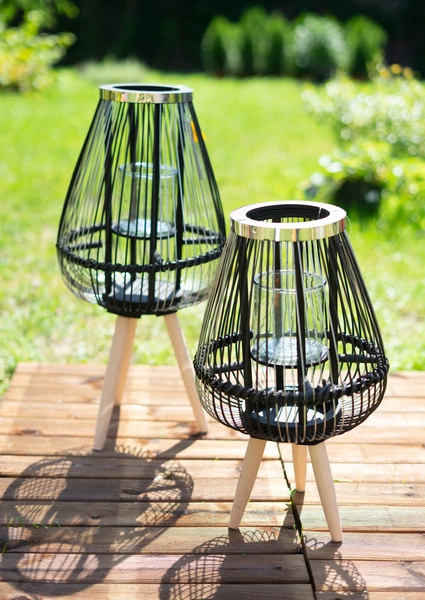 Atrakcyjny wizualnie lampion, który wniesie do wnętrza całą gamę uroku. Przygotowany został z drewna i metalu - drewniana konstrukcja kryje w sobie szklane naczynie na świecę, a całość otaczają druty w kolorze czerni i srebra. Konstrukcję umocowano na drewnianych nogach.