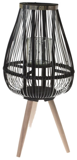 Atrakcyjny wizualnie lampion, który wniesie do wnętrza całą gamę uroku. Przygotowany został z drewna i metalu - drewniana konstrukcja kryje w sobie szklane naczynie na świecę, a całość otaczają druty w kolorze czerni i srebra. Konstrukcję umocowano na drewnianych nogach.