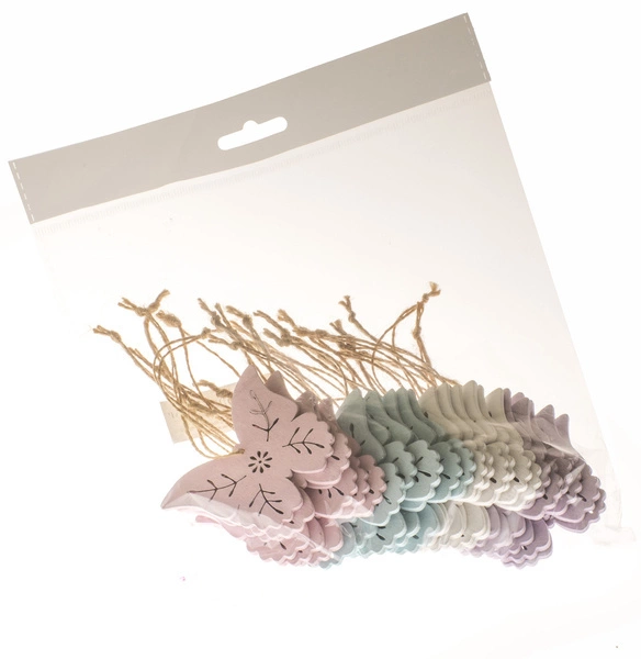 Zawieszki przygotowane w formie motyli. Zawieszki zostały pomalowane na cztery kolory - fiolet, biel, róż i błękit, a także posiadają na powierzchni wycięte delikatne, ażurowe zdobienie. Stanowią atrakcyjną formę dekoracji korespondującą z okresem świąt Wielkanocy, ale mogą być wykorzystane również przy innych okazjach. Sprawdzają się doskonale jako ozdoba samodzielna, jak również jako składnik większej kompozycji dekoracyjnej.