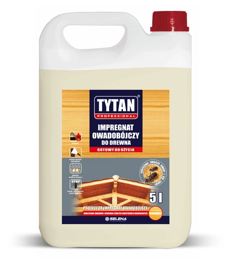 Tytan impregnat owadobójczy 5l bezbarwny do drewna doskonale sprawdza się przy zabezpieczaniu więźby dachowej, odeskowania dachów, drewnianych elementów konstrukcyjnych, schodów, mebli oraz domowych sprzętów drewnianych. Produkt przeznaczony jest do użycia w budownictwie, remontach i konserwacji drewna narażonego na działanie szkodników.