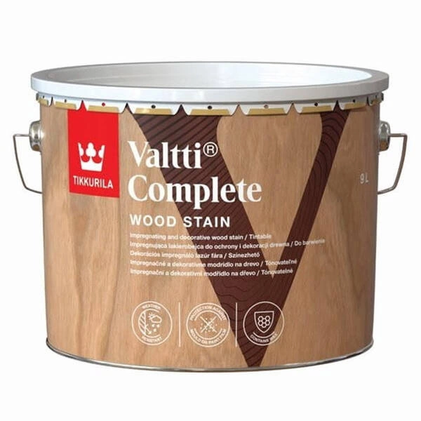 Bardzo trwała, półmatowa, impregnująco-dekorująca lakierobejca do malowania drewna na zewnątrz pomieszczeń, do barwienia. Stworzona na bazie innowacyjnej technologii Triple Resin System, opartej na unikalnym połączeniu trzech wysokiej jakości żywic o różnej funkcjonalności, gwarantujących zwiększoną odporność i zabezpieczenie pomalowanej powłoki. Dodatkowo Tikkurila Valtti Complete posiada Double Absorb UV System (podwójny system ochrony przed promieniowaniem UV).
