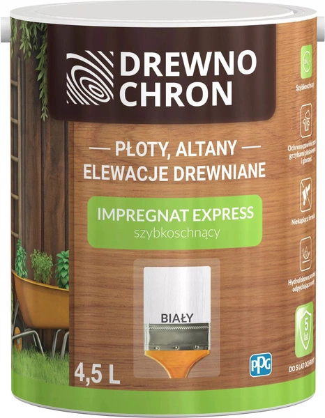 Drewnochron Express jest wysokiej klasy sprawdzonym impregnatem przeznaczonym do zabezpieczania drewnianych konstrukcji znajdujących się na zewnątrz domu. Doskonale pasuje do nieznacznej architektury ogrodowej np. płotków pergoli, ławek drewutni itp. Ponadto idealnie sprawdzi się jako zabezpieczenie np altanek, huśtawek, szop, wiat, ogrodzeń drewnianych itp.