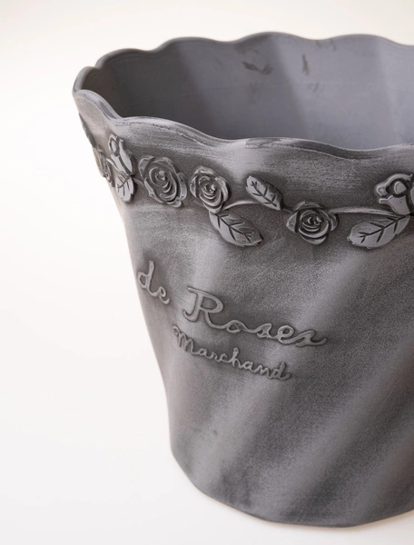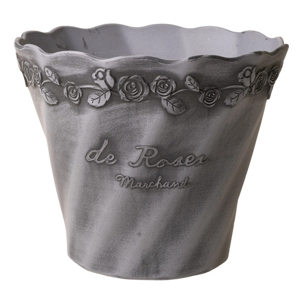 Osłonka vintage w kolorze grafitowym z motywem różanym o wysokości 20 cm odpowiednia do wnętrz, jak i na zewnątrz - odporna na warunki atmosferyczne.