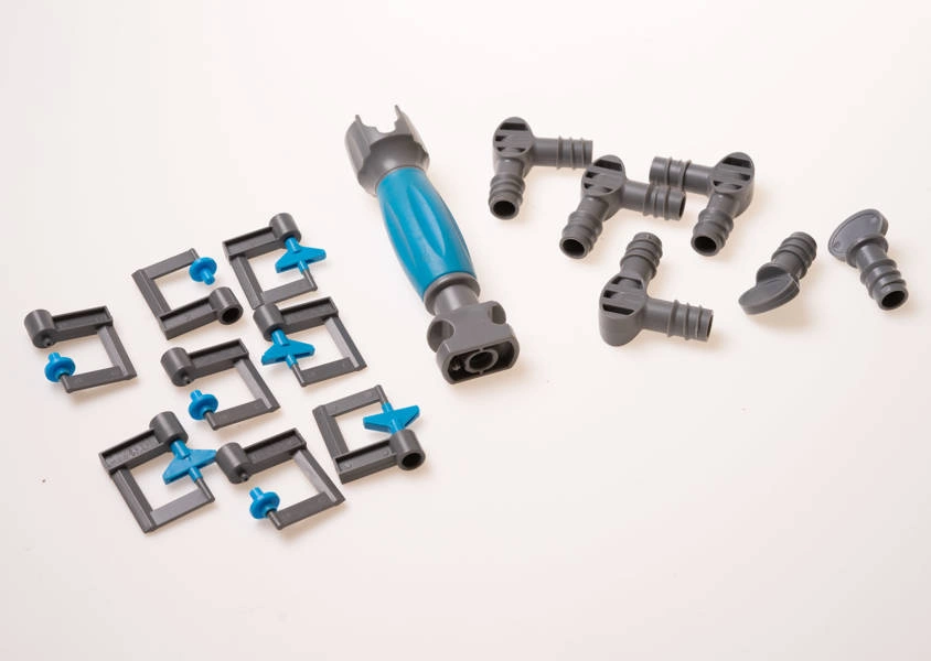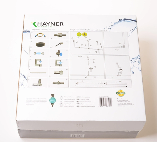 - Elementy zestawu: wąż przyłączeniowy z nakrętką, reduktor, 8 trójników, 8 kotw mocujących, 10 rurek z wkrętkami, 6 zaworów, 4 spryskiwacze nieruchome, 4 spryskiwacze obrotowe (zasięg ok. 360 cm), 4 kątowniki, 1 zaślepka węża, 1 klucz dokręcający/dziurkacz