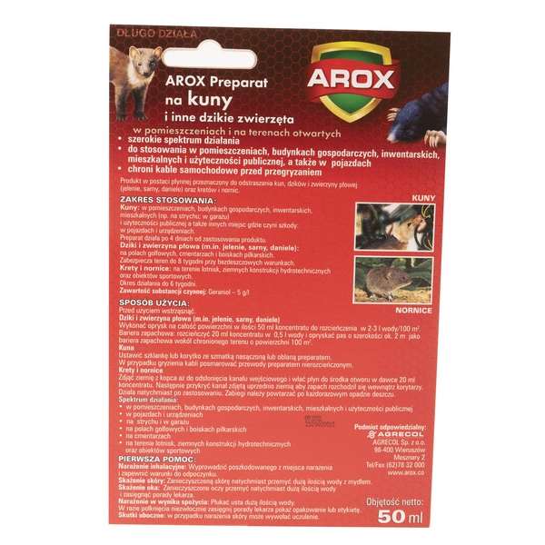 Płyn odstraszający kuny i inne dzikie zwierzęta 50 ml AROX to skuteczny preparat, który zapewnia ochronę przed kunami, dzikami, jeleniami, sarnami, danielami, kretami oraz nornicami. Preparat w postaci płynnej tworzy barierę zapachową, odstraszającą niepożądane zwierzęta zarówno w pomieszczeniach, budynkach gospodarczych i mieszkalnych, jak i w pojazdach. Dzięki specjalnej formule chroni kable samochodowe przed przegryzaniem oraz zabezpiecza miejsca narażone na obecność dzikiej zwierzyny. Działa nawet do 6 tygodni, zapewniając długotrwałą ochronę.