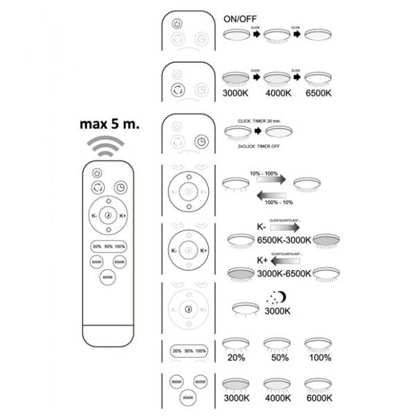 Do lampy dołączony został pilot, którym wygodnie i szybko dostosujemy barwę światła do naszych potrzeb - ciepłą, neutralną lub zimną (3000K, 4000K, 6500K).