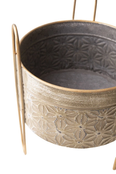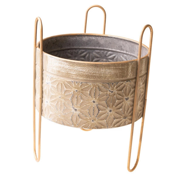 Okrągła osłonka na trzech nóżkach z tłoczonym wzorem i złotym rantem. Wykonana z metalu pomalowanego na jasno-zielony kolor, patynowana. Fantastyczny element dekoracyjny, który podkreśli urok roślin, które się w nim znajdą.