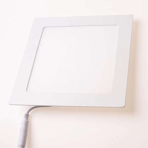 Jasno świecący plafon LED podtynkowy o kwadratowym kształcie emitujący zimne białe światło, charakteryzujący się niskim zużyciem energii, co sprawia, że jest produktem o wyższych właściwościach ekologicznych.
