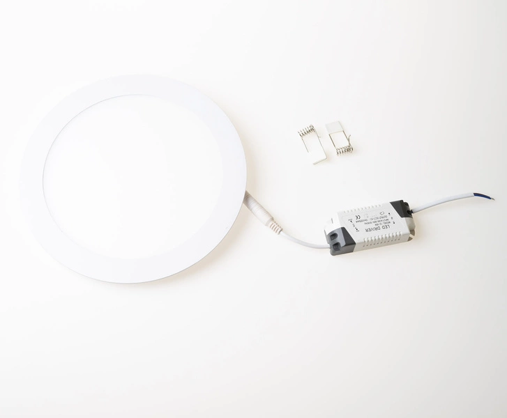Jasno świecący plafon LED podtynkowy o okrągłym kształcie emitujący ciepłe białe światło, charakteryzujący się niskim zużyciem energii, co sprawia, że jest produktem o wyższych właściwościach ekologicznych.