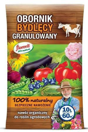 Florovit pro natura obornik granulowany to w 100% nawóz naturalny pochodzenia zwierzęcego. Dzięki nowoczesnej technologii przetwarzania i oczyszczania obornik zachowuje wszystkie substancje próchnicze, odżywcze i mineralne, jednocześnie pozbawiony jest wszelkich patogenów oraz nasion chwastów. Obornik granulowany jest nawozem organicznym szczególnie polecanym do upraw ogrodniczych, w tym drzew i krzewów owocowych oraz roślin ozdobnych.