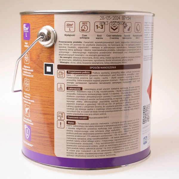 Lakierobejca wyprodukowana z żywic, pigmentów mikronizowanych i filtrów UV pozwala na uzyskanie elastycznej, nie łuszczącej się i nie pękającej powłoki o wysokiej trwałości, odporności i estetyce w półmatowym wykończeniu. Przeznaczona jest do ochronnego i dekoracyjnego malowania przedmiotów drewnianych oraz drewnopochodnych eksploatowanych wewnątrz i na zewnątrz pomieszczeń.