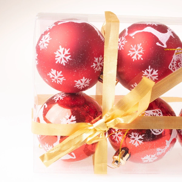 - Komplet zawiera 8 okrągłych bombek – 4 matowe i 4 błyszczące, wszystkie w pięknej czerwieni z białymi wzorami.