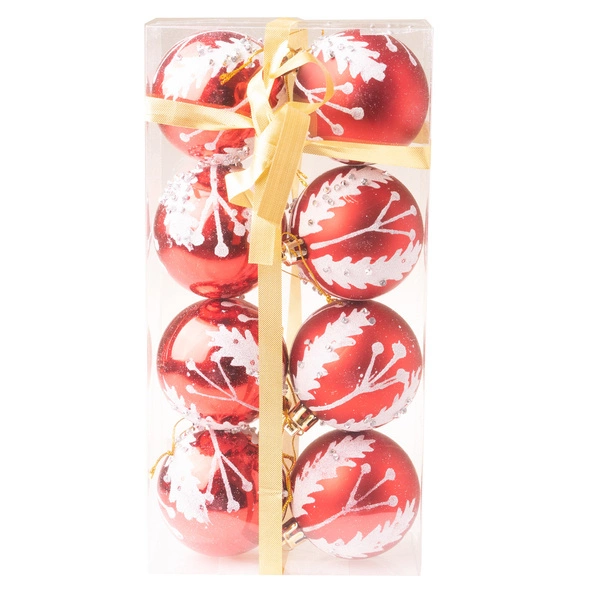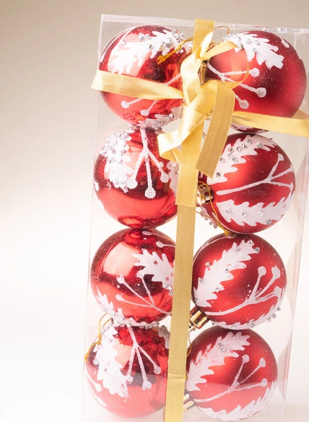 Komplet ośmiu okrągłych bombek w kolorze czerwonym z biało-złotymi wzorami: 4 matowych i 4 błyszczących. Stanowią bardzo atrakcyjną formę dekoracji, podkreślającą klimat i nastrój świąt.