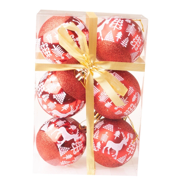 Bombki czerwone brokatowe z reniferem i choinką 7 cm 6 sztuk