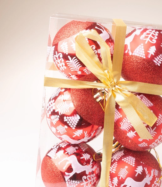 - Bombki czerwone brokatowe z reniferem i choinką 7 cm 6 sztuk