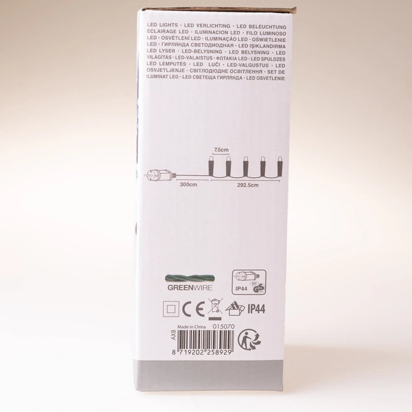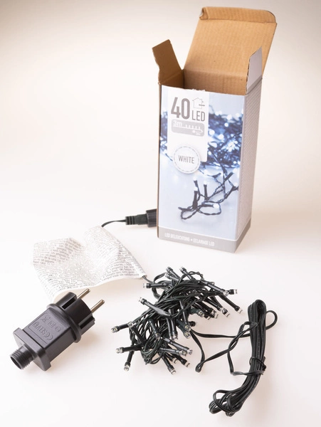Oświetlenie świąteczne do stosowania zarówno na zewnątrz jak i wewnątrz, składające się z 40 ledowych lampek umieszczonych na ciemnozielonym przewodzie. Lampki świecą białym zimnym światłem. Stanowią bardzo atrakcyjną dekorację, która nada magii w czasie świąt Bożego Narodzenia.