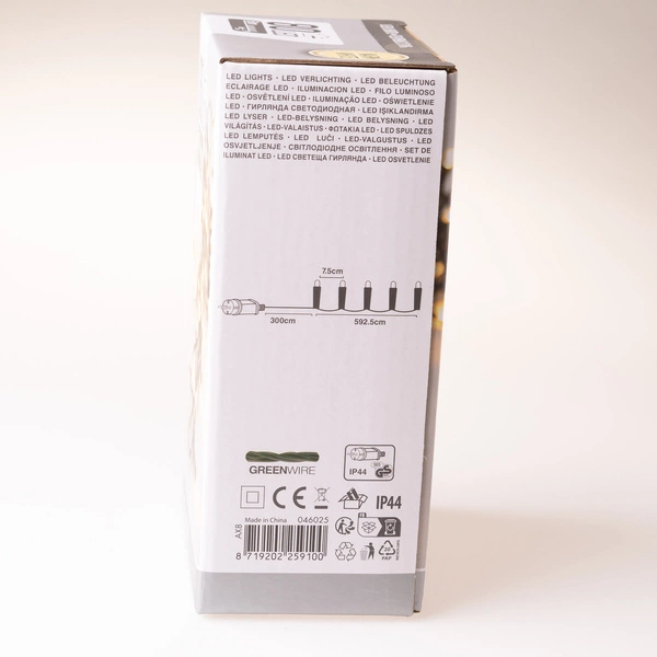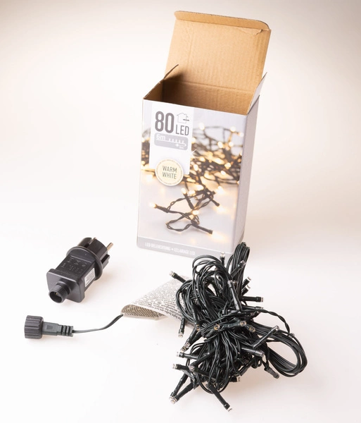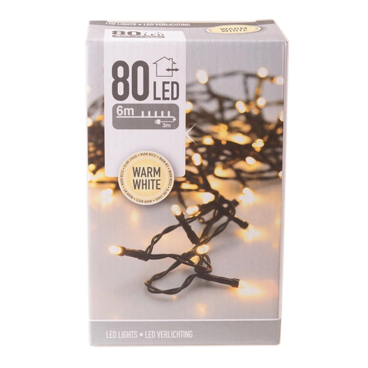 Oświetlenie świąteczne do stosowania zarówno na zewnątrz jak i wewnątrz, składające się z 80 ledowych lampek umieszczonych na ciemnozielonym przewodzie. Lampki świecą ciepłym białym światłem. Stanowią bardzo atrakcyjną dekorację, która nada magii w czasie świąt Bożego Narodzenia.