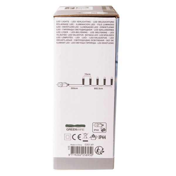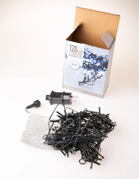 Oświetlenie świąteczne do stosowania zarówno na zewnątrz jak i wewnątrz, składające się z 120 ledowych lampek umieszczonych na ciemnozielonym przewodzie. Lampki świecą białym zimnym światłem. Stanowią bardzo atrakcyjną dekorację, która nada magii w czasie świąt Bożego Narodzenia.