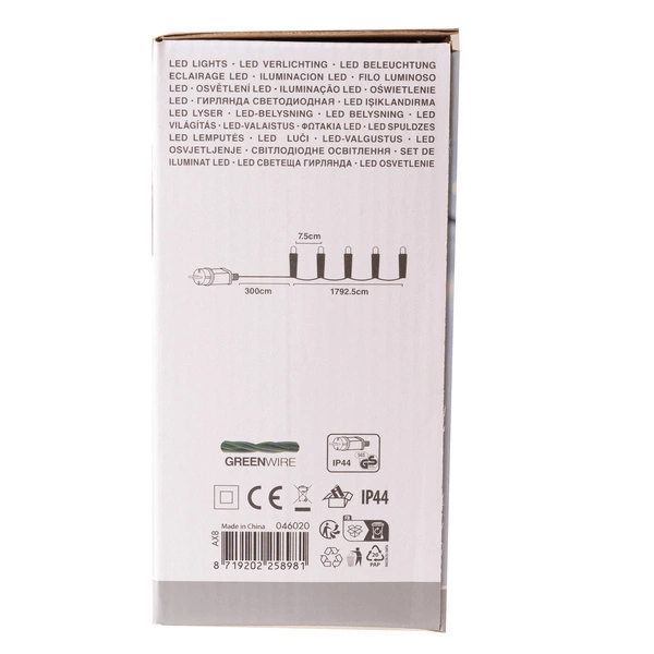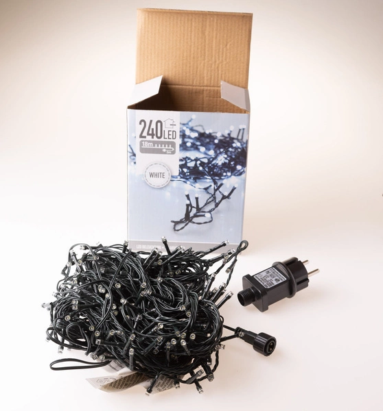 Oświetlenie świąteczne do stosowania zarówno na zewnątrz jak i wewnątrz, składające się z 240 ledowych lampek umieszczonych na ciemnozielonym przewodzie. Lampki świecą białym zimnym światłem. Stanowią bardzo atrakcyjną dekorację, która nada magii w czasie świąt Bożego Narodzenia.