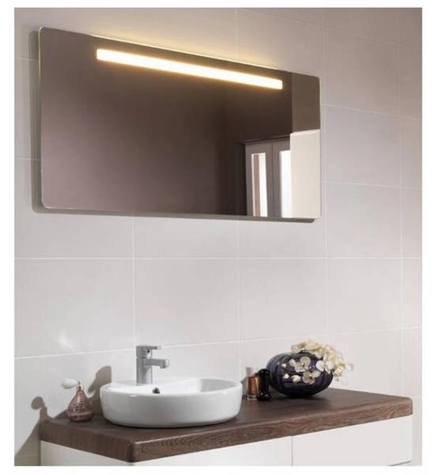 Lustro łazienkowe, przygotowane ze zintegrowanym oświetleniem. Lustro w kształcie prostokąta, z owalnymi zakończeniami rogów.