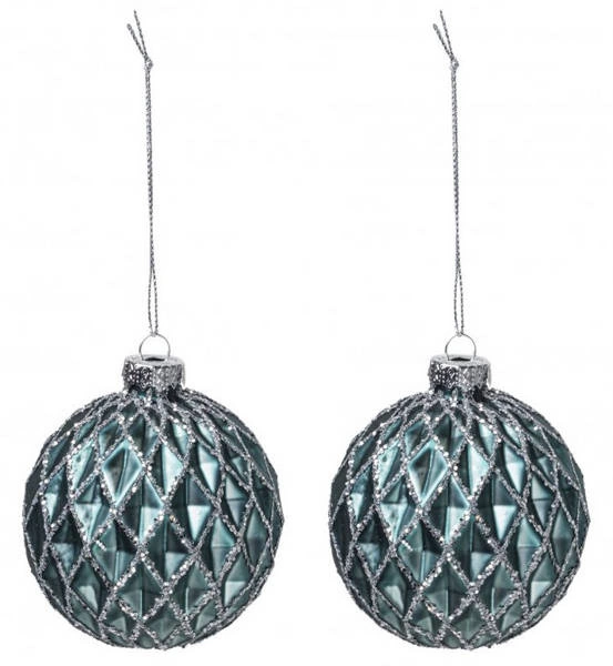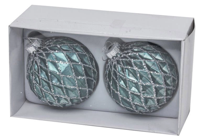 Bombki choinkowe przygotowane w klasycznym, okrągłym kształcie. Utrzymane zostały w jednej stylistyce kolorystycznej - turkusowej. Ich powierzchnię ozdobiono rombami w srebrnym kolorze. Stanowią bardzo atrakcyjną formę dekoracji bożonarodzeniowego drzewka, podkreślającą klimat i nastrój świąt. Wprowadzają do wnętrza ciepłą atmosferę i cieszą oko.