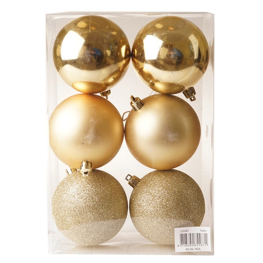 Bombki choinkowe przygotowane w klasycznym, okrągłym kształcie i w jednej stylistyce kolorystycznej - złotej. W trzech wersjach - matowe, błyszczące i z brokatem. Stanowią bardzo atrakcyjną formę dekoracji bożonarodzeniowego drzewka, podkreślającą klimat i nastrój świąt.
